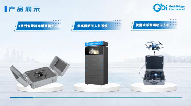 - 主要产品包括便携式系留照明无人机、共享型照明无人机、全自动机巢式系留无人机系统、编队灯光秀无人机等;其中便携式照明无人机为极客桥原始产品,多项指标世界领先,在火神山雷神山医院建设、土耳其地震和甘肃地震救援、洞庭湖决堤口合龙、西藏地震救援、缅甸地震救援等重大事件中屡建战功,被央视誉为“夜空中最亮的星”,被海内外媒体称为“中国奇迹”“生命之光”“希望之光”。