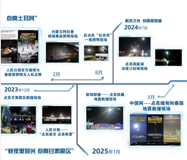 极客桥致力于发挥它的社会价值,爱心服务社会。极客桥无人机应用领域广泛,在生产、应急救援、文旅融合、社会治理、强力部门、军事领域都能见到它的身影。其照明无人机发挥了“点亮夜空 拯救生命 面向世界”的重大价值,参与了上百次国内外水灾、火灾、地震等突发重大事件的应急救援抢险,如支援“火神山”“雷神山”建设、参与广西贺州水上营救、点亮土耳其地震救援现场等。