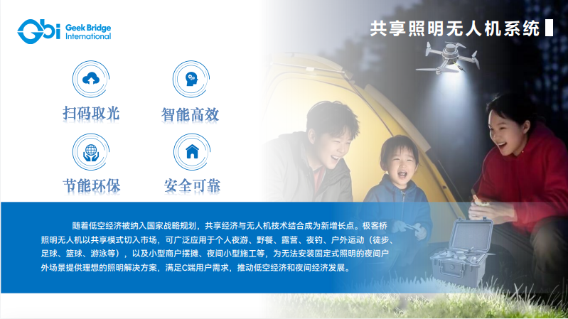 极客桥面对需“在复杂环境下长时间不间断运行的户外照明”这一全球性难题,颠覆性创新,开发出便携式照明无人机,包含了夜间户外照明设备所需的所有基本功能,重新定义了户外应急照明。